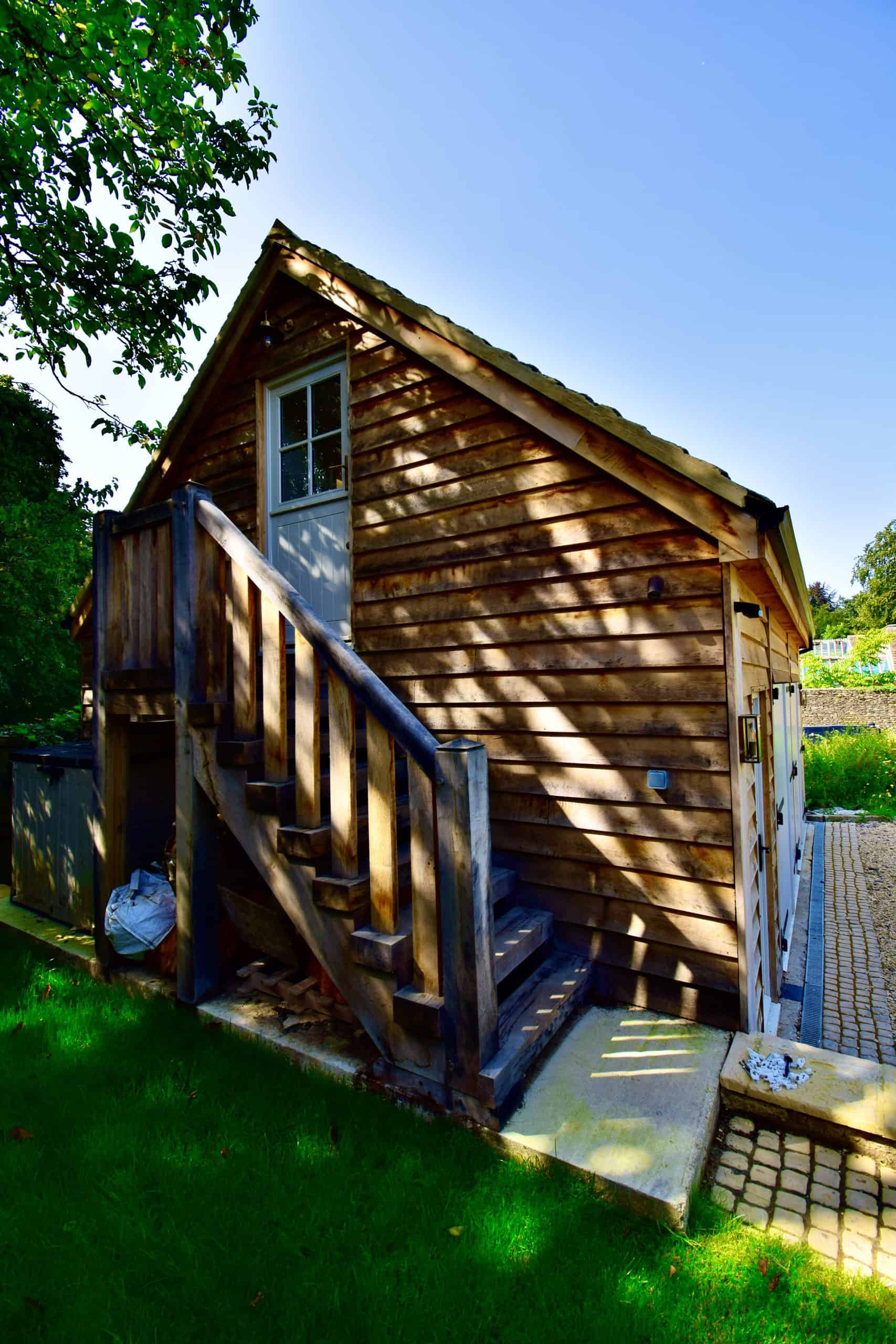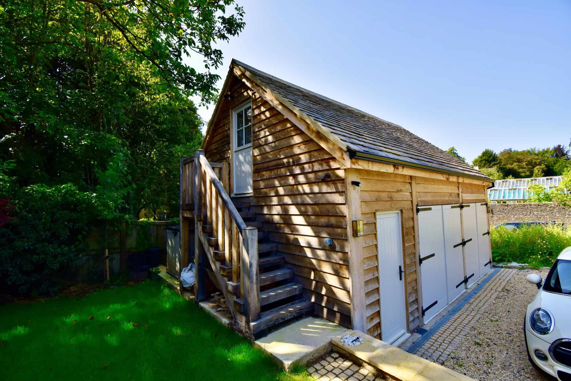 A 2 ½ bay garage with first floor across 2 bays with the end ½ bay open to the ridge letting in natural light for the car workshop. First floor accommodation, accessed by an external, massive, hand made, solid oak staircase leading up to a double guest bedroom and bathroom.