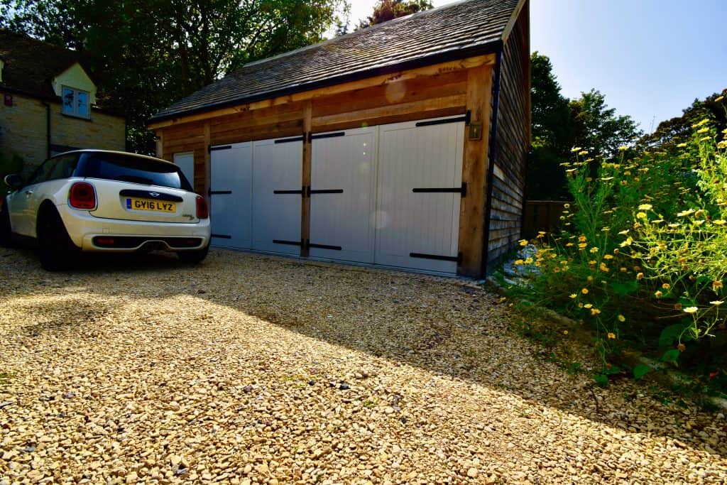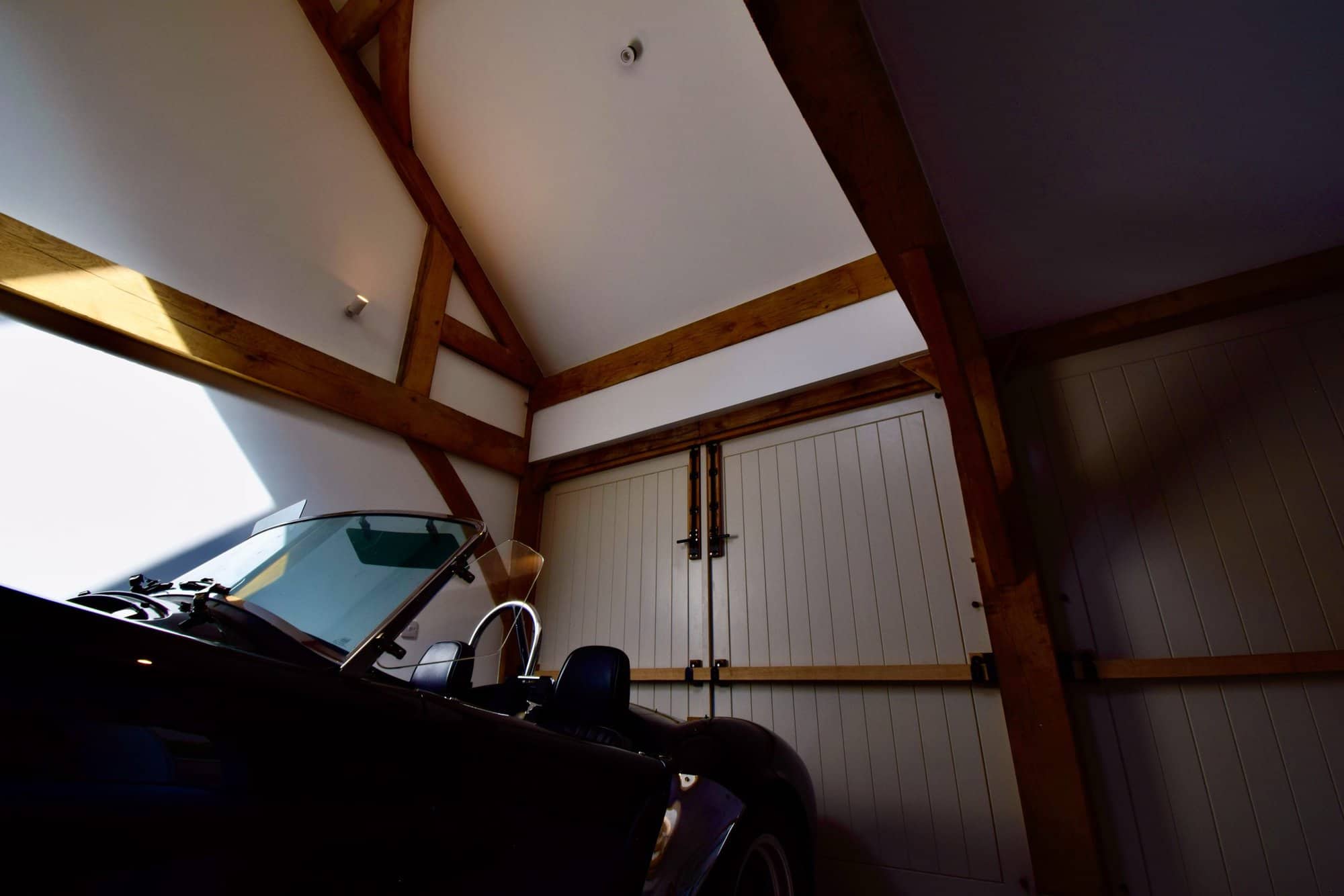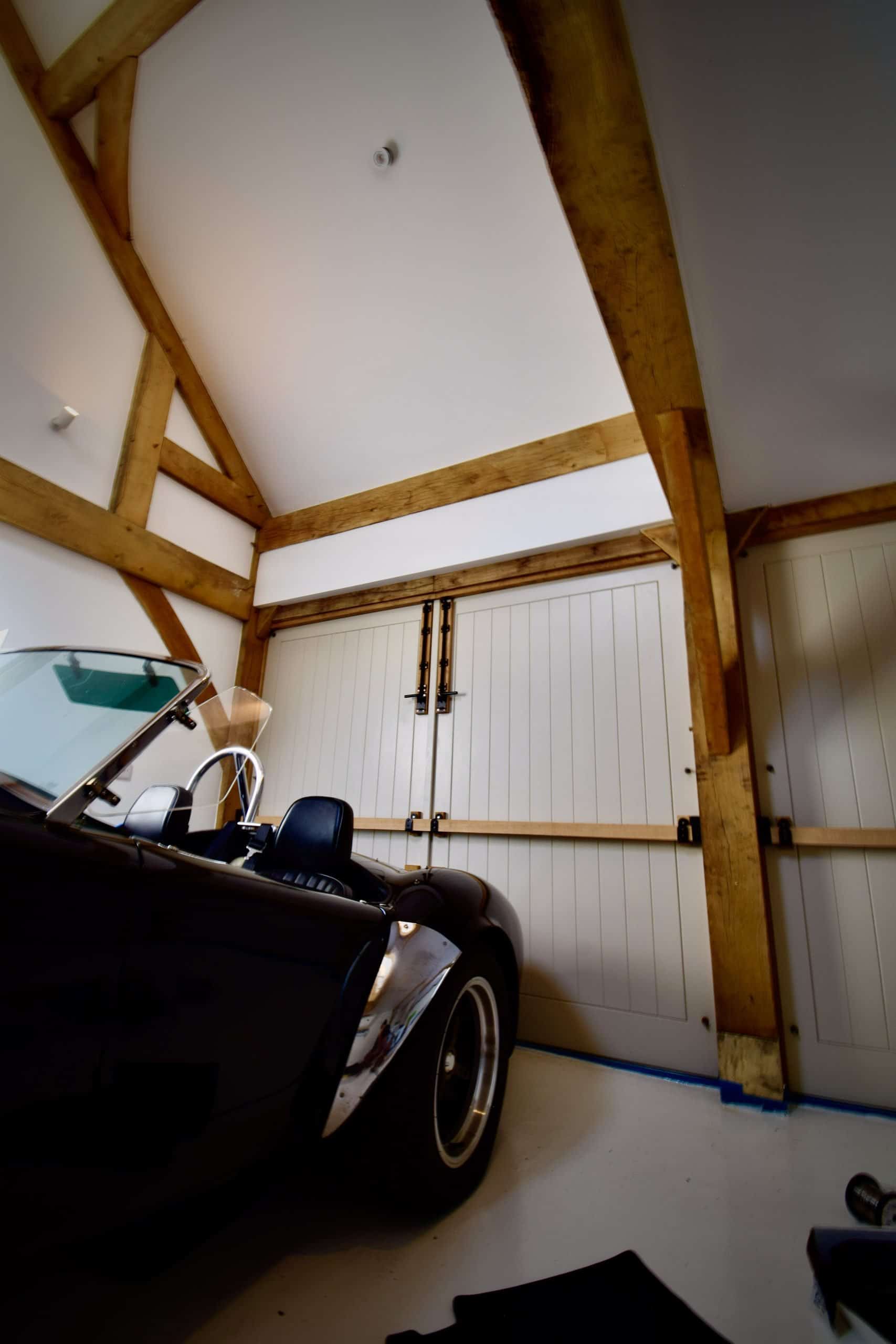 The result is a fabulous garage, making best use of the space available, accommodating height restrictions and achieving the longed for guest accommodation above. And above all the perfect workshop/garage space to work on the car and even space to fit a gym!