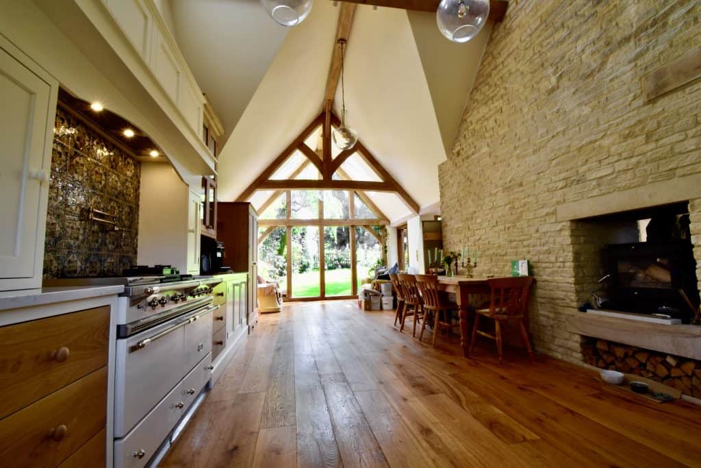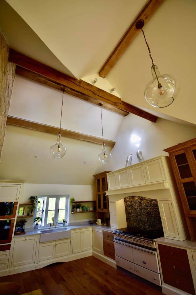 Cathy was keen to choose a kitchen to suit the building they’d created, not the other way around. So they commissioned stunning tall oak wall cabinets which are in perfect proportion to the high oak kitchen ceiling, beautifully contrasted by the lower cream coloured units, set off by hand painted tiles, range cooker and of course the brushed brass boiling water tap!